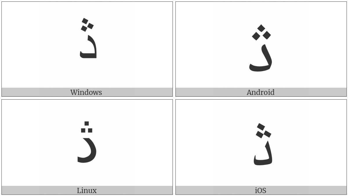 The image below shows how the “Arabic Letter Dul” symbol might look like on different operating systems. If the font in which this web site is displayed does not contain the symbol and there is no fallback font able to render it, you can use the image below to get an idea of what it should look like.