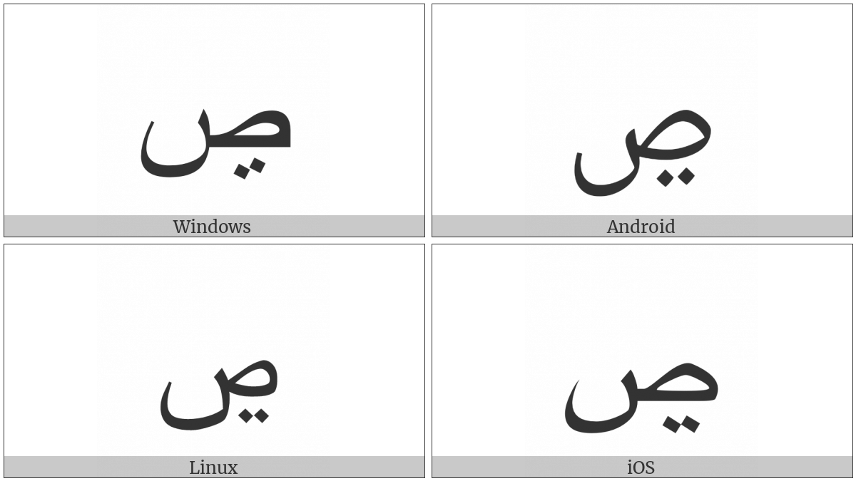 The image below shows how the “Arabic Letter Sad With Two Dots Below” symbol might look like on different operating systems. If the font in which this web site is displayed does not contain the symbol and there is no fallback font able to render it, you can use the image below to get an idea of what it should look like.