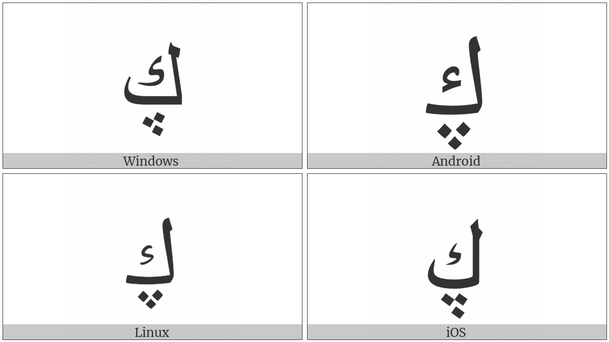 The image below shows how the “Arabic Letter Kaf With Three Dots Below” symbol might look like on different operating systems. If the font in which this web site is displayed does not contain the symbol and there is no fallback font able to render it, you can use the image below to get an idea of what it should look like.