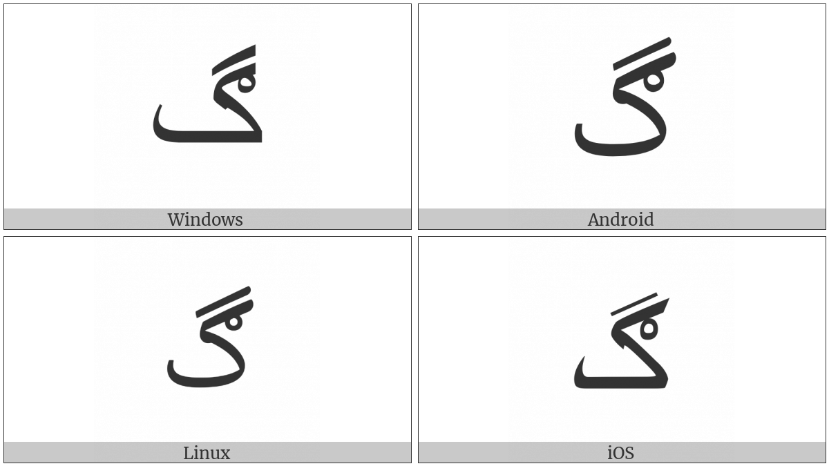 The image below shows how the “Arabic Letter Gaf With Ring” symbol might look like on different operating systems. If the font in which this web site is displayed does not contain the symbol and there is no fallback font able to render it, you can use the image below to get an idea of what it should look like.
