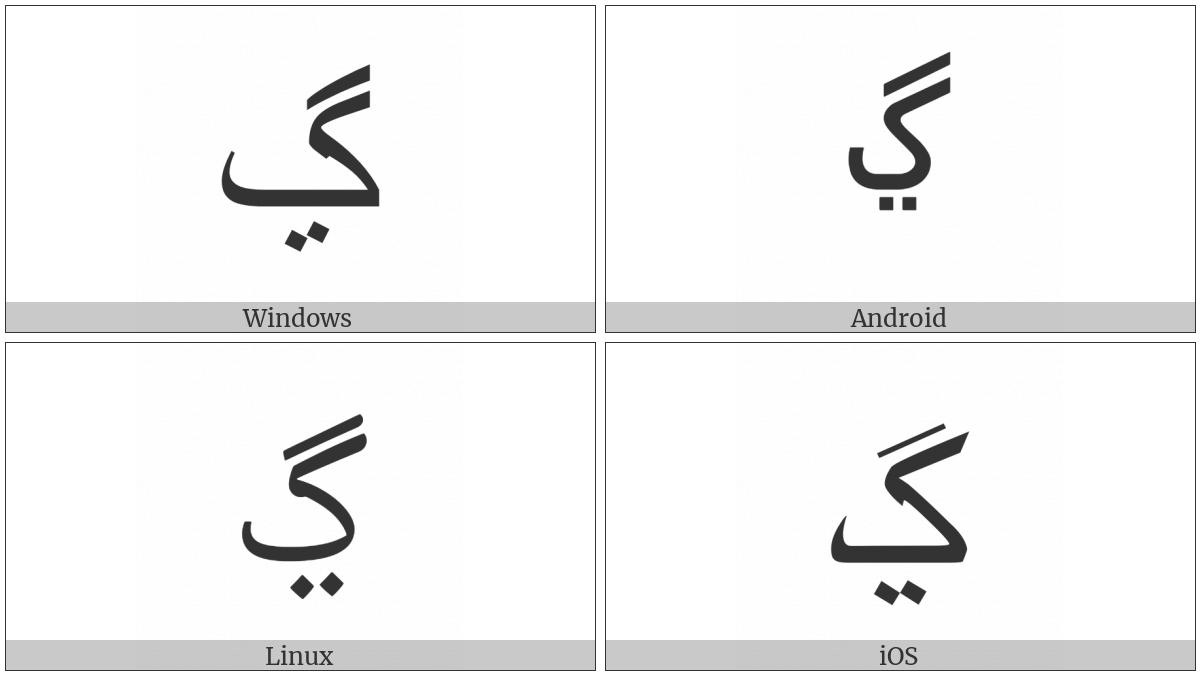 The image below shows how the “Arabic Letter Gaf With Two Dots Below” symbol might look like on different operating systems. If the font in which this web site is displayed does not contain the symbol and there is no fallback font able to render it, you can use the image below to get an idea of what it should look like.