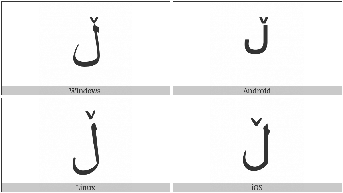 The image below shows how the “Arabic Letter Lam With Small V” symbol might look like on different operating systems. If the font in which this web site is displayed does not contain the symbol and there is no fallback font able to render it, you can use the image below to get an idea of what it should look like.