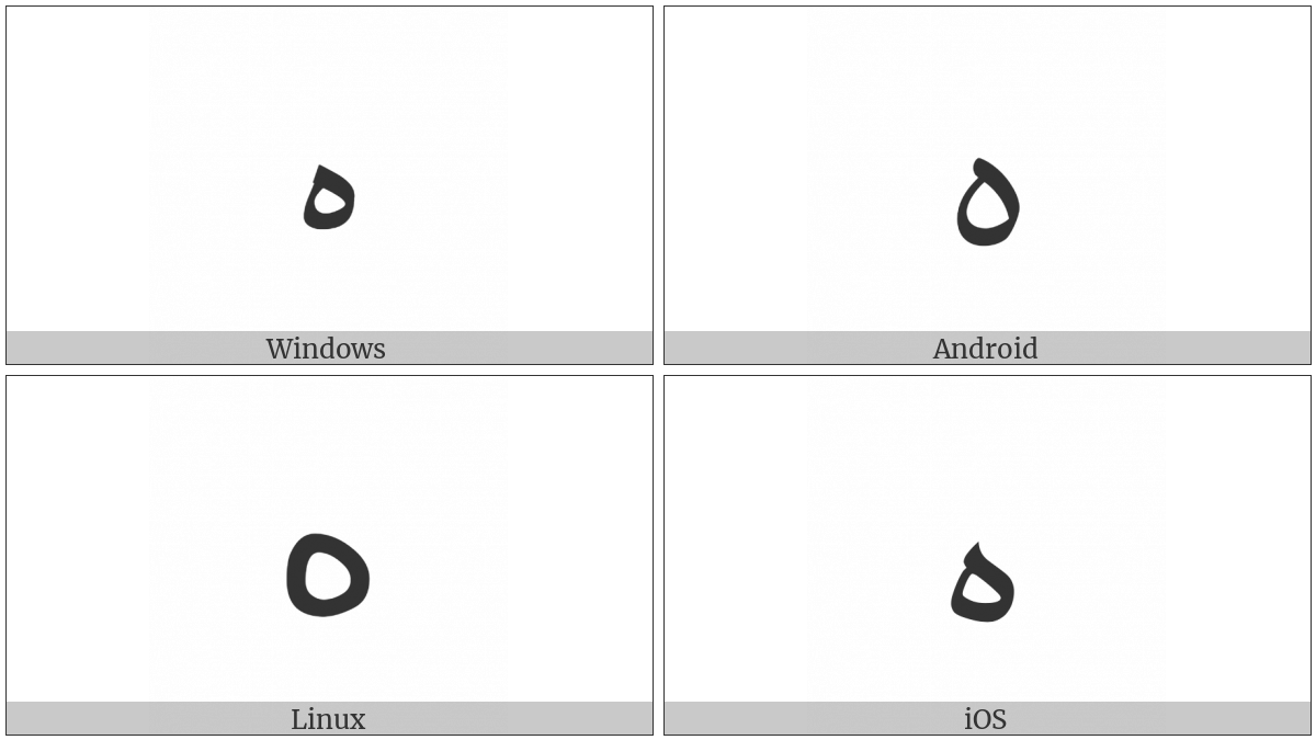 The image below shows how the “Arabic Letter Ae” symbol might look like on different operating systems. If the font in which this web site is displayed does not contain the symbol and there is no fallback font able to render it, you can use the image below to get an idea of what it should look like.