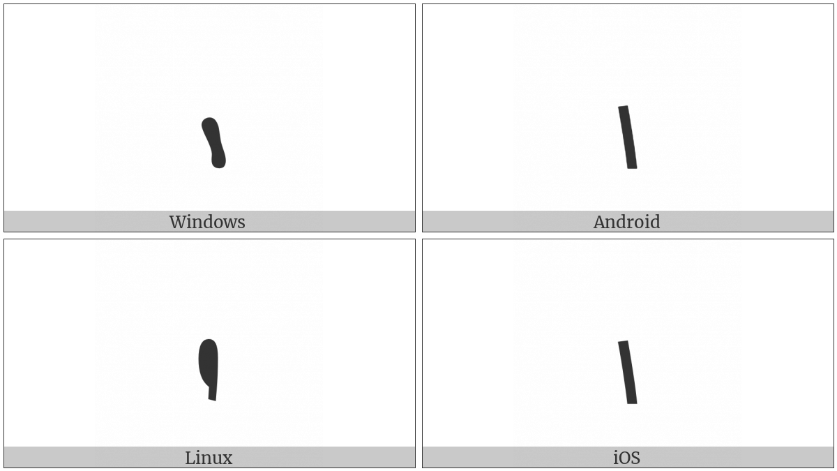 The image below shows how the “Syriac Letter Zain” symbol might look like on different operating systems. If the font in which this web site is displayed does not contain the symbol and there is no fallback font able to render it, you can use the image below to get an idea of what it should look like.
