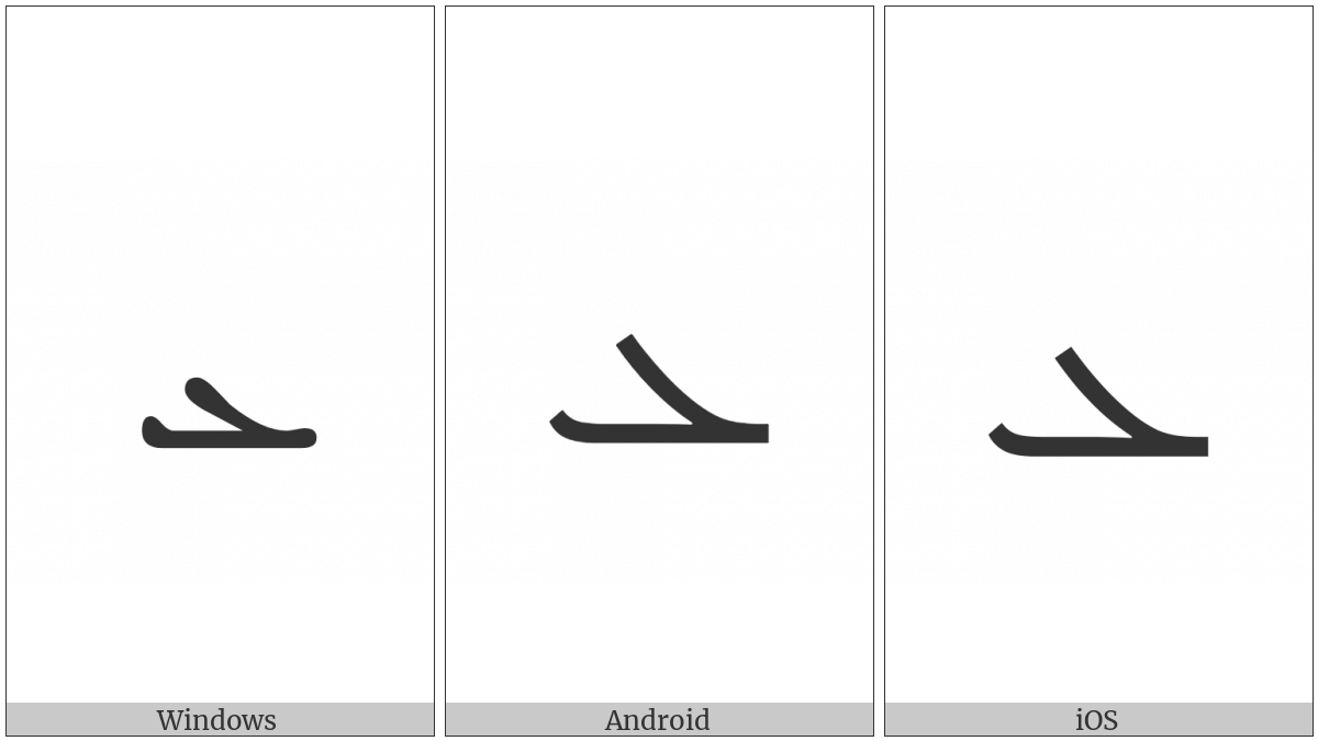 The image below shows how the “Syriac Letter E” symbol might look like on different operating systems. If the font in which this web site is displayed does not contain the symbol and there is no fallback font able to render it, you can use the image below to get an idea of what it should look like.