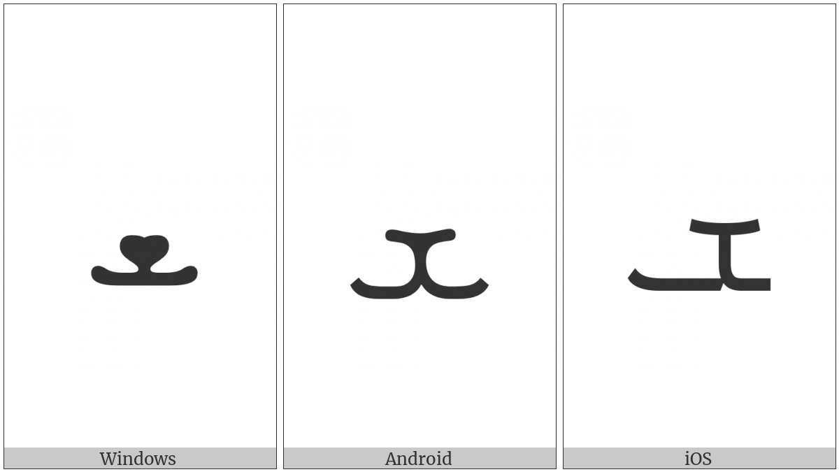 The image below shows how the “Syriac Letter Shin” symbol might look like on different operating systems. If the font in which this web site is displayed does not contain the symbol and there is no fallback font able to render it, you can use the image below to get an idea of what it should look like.