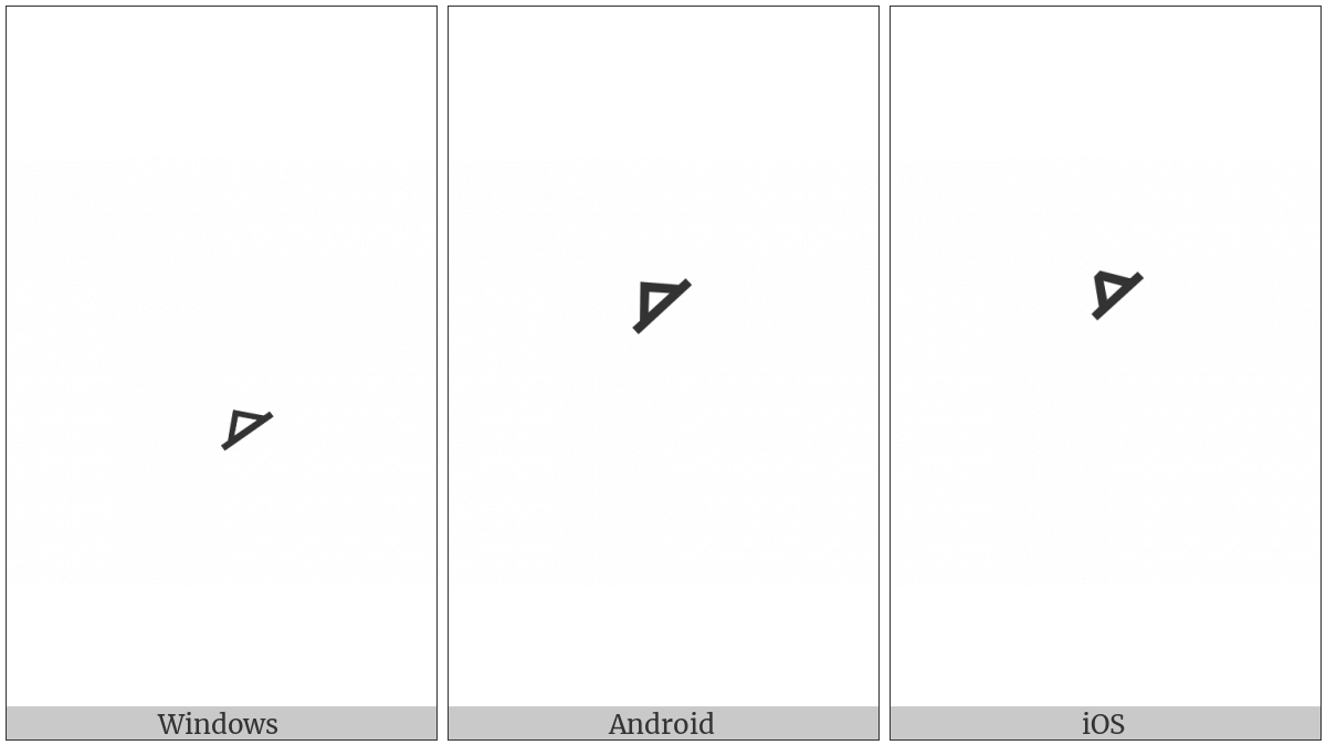 The image below shows how the “Syriac Pthaha Above” symbol might look like on different operating systems. If the font in which this web site is displayed does not contain the symbol and there is no fallback font able to render it, you can use the image below to get an idea of what it should look like.