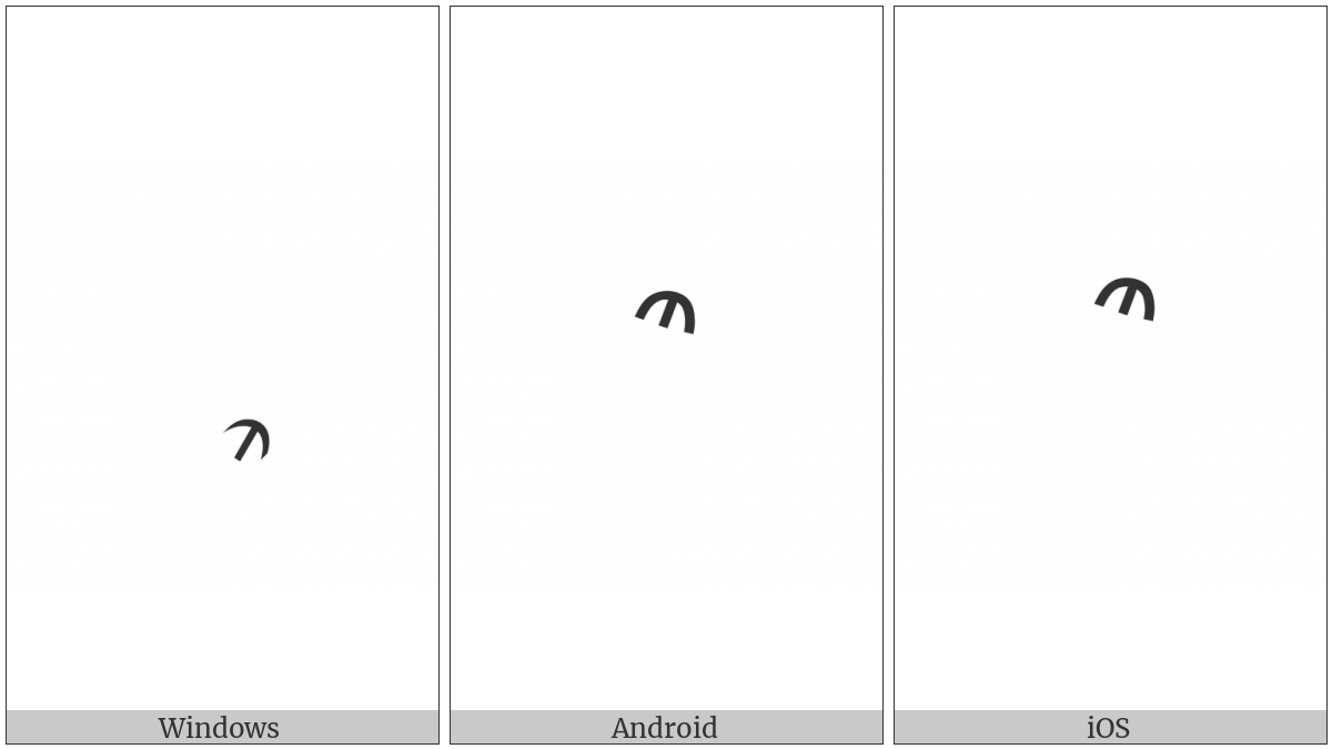 The image below shows how the “Syriac Rbasa Above” symbol might look like on different operating systems. If the font in which this web site is displayed does not contain the symbol and there is no fallback font able to render it, you can use the image below to get an idea of what it should look like.