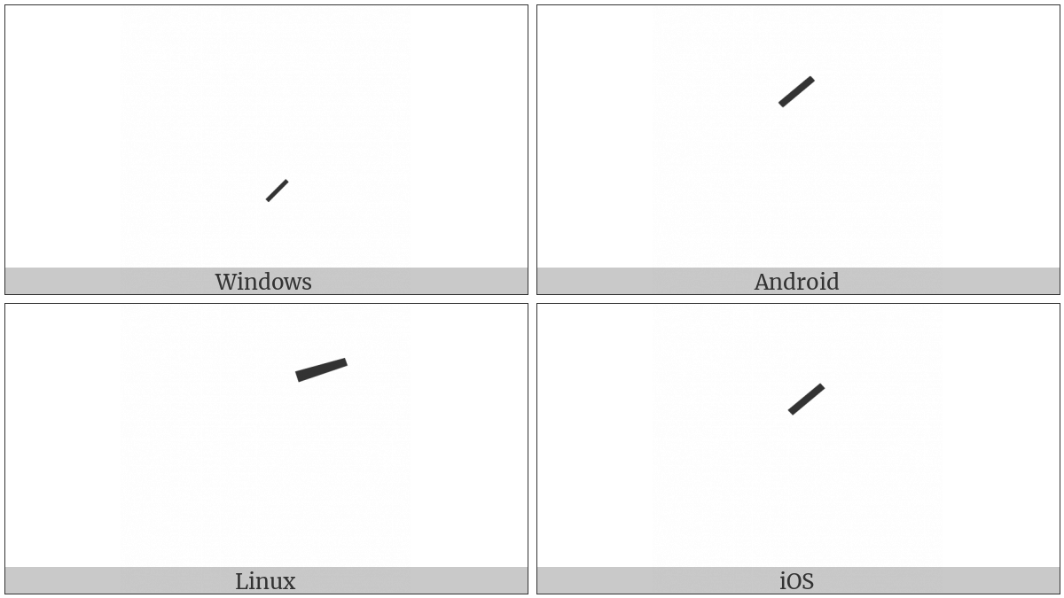The image below shows how the “Syriac Oblique Line Above” symbol might look like on different operating systems. If the font in which this web site is displayed does not contain the symbol and there is no fallback font able to render it, you can use the image below to get an idea of what it should look like.