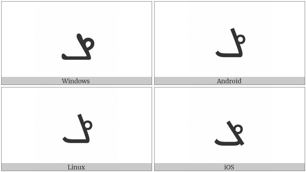 The image below shows how the “Syriac Letter Sogdian Fe” symbol might look like on different operating systems. If the font in which this web site is displayed does not contain the symbol and there is no fallback font able to render it, you can use the image below to get an idea of what it should look like.