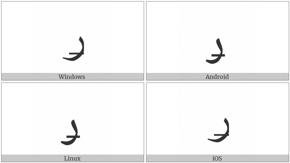 The image below shows how the “Arabic Letter Reh With Stroke” symbol might look like on different operating systems. If the font in which this web site is displayed does not contain the symbol and there is no fallback font able to render it, you can use the image below to get an idea of what it should look like.