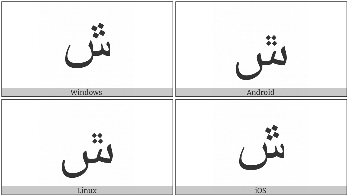 The image below shows how the “Arabic Letter Seen With Four Dots Above” symbol might look like on different operating systems. If the font in which this web site is displayed does not contain the symbol and there is no fallback font able to render it, you can use the image below to get an idea of what it should look like.