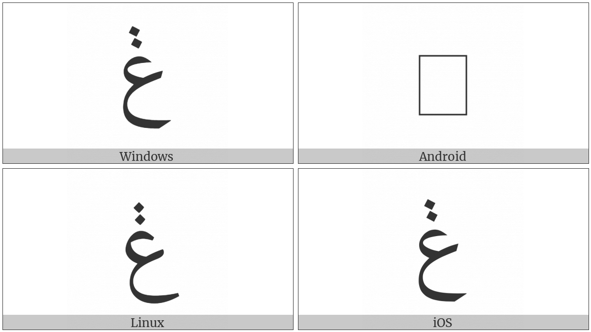The image below shows how the “Arabic Letter Ain With Two Dots Vertically Above” symbol might look like on different operating systems. If the font in which this web site is displayed does not contain the symbol and there is no fallback font able to render it, you can use the image below to get an idea of what it should look like.