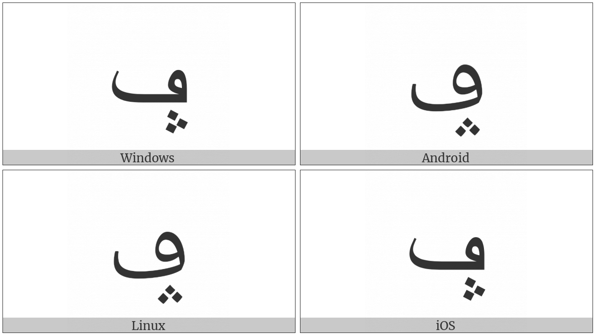 The image below shows how the “Arabic Letter Feh With Three Dots Pointing Upwards Below” symbol might look like on different operating systems. If the font in which this web site is displayed does not contain the symbol and there is no fallback font able to render it, you can use the image below to get an idea of what it should look like.