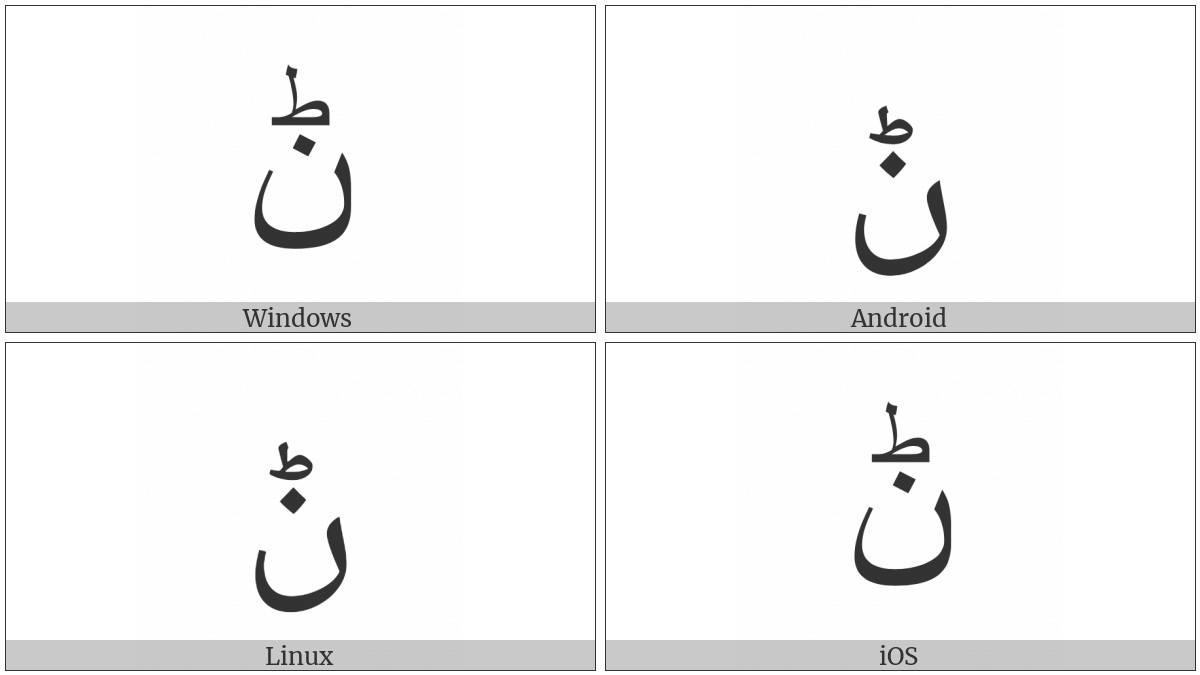 The image below shows how the “Arabic Letter Noon With Small Tah” symbol might look like on different operating systems. If the font in which this web site is displayed does not contain the symbol and there is no fallback font able to render it, you can use the image below to get an idea of what it should look like.