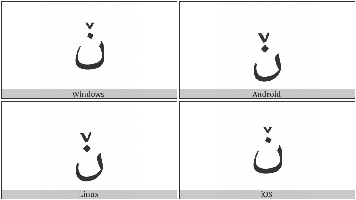 The image below shows how the “Arabic Letter Noon With Small V” symbol might look like on different operating systems. If the font in which this web site is displayed does not contain the symbol and there is no fallback font able to render it, you can use the image below to get an idea of what it should look like.