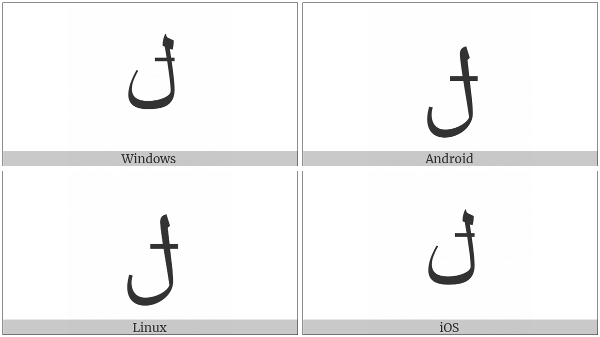 The image below shows how the “Arabic Letter Lam With Bar” symbol might look like on different operating systems. If the font in which this web site is displayed does not contain the symbol and there is no fallback font able to render it, you can use the image below to get an idea of what it should look like.