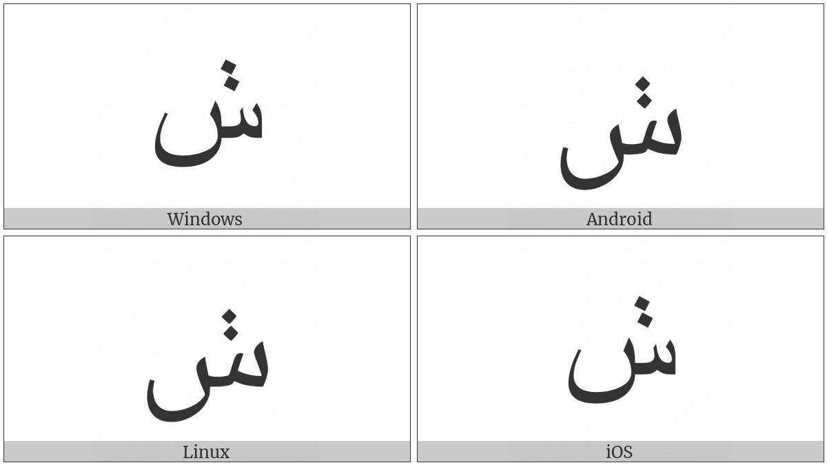 The image below shows how the “Arabic Letter Seen With Two Dots Vertically Above” symbol might look like on different operating systems. If the font in which this web site is displayed does not contain the symbol and there is no fallback font able to render it, you can use the image below to get an idea of what it should look like.