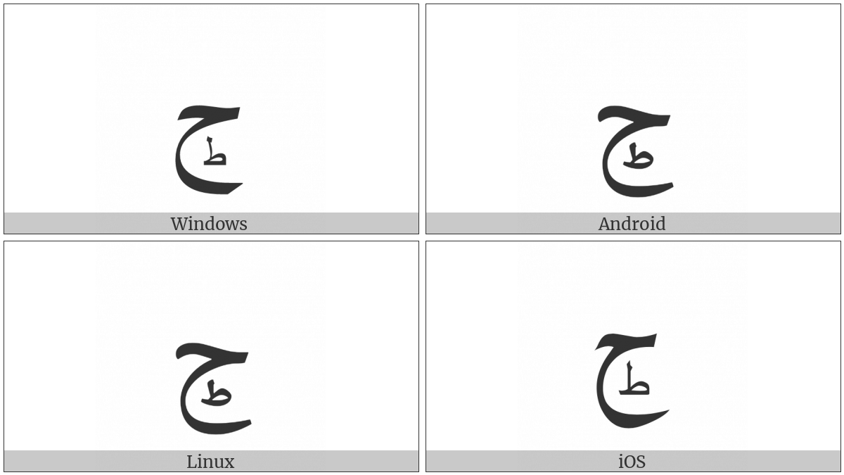 The image below shows how the “Arabic Letter Hah With Small Arabic Letter Tah Below” symbol might look like on different operating systems. If the font in which this web site is displayed does not contain the symbol and there is no fallback font able to render it, you can use the image below to get an idea of what it should look like.