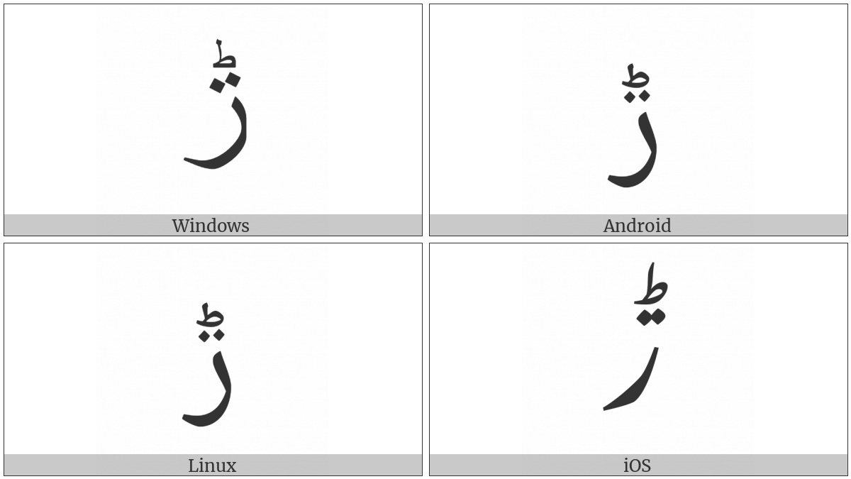 The image below shows how the “Arabic Letter Reh With Small Arabic Letter Tah And Two Dots” symbol might look like on different operating systems. If the font in which this web site is displayed does not contain the symbol and there is no fallback font able to render it, you can use the image below to get an idea of what it should look like.