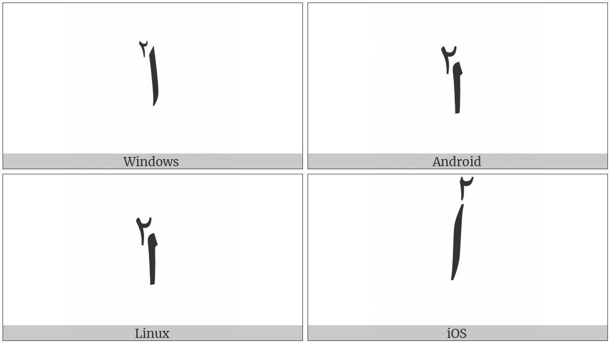 The image below shows how the “Arabic Letter Alef With Extended Arabic-Indic Digit Two Above” symbol might look like on different operating systems. If the font in which this web site is displayed does not contain the symbol and there is no fallback font able to render it, you can use the image below to get an idea of what it should look like.