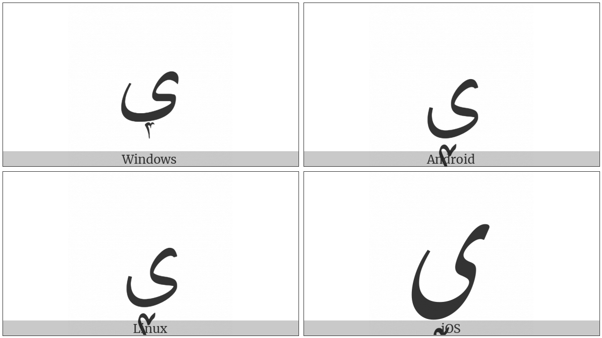 The image below shows how the “Arabic Letter Farsi Yeh With Extended Arabic-Indic Digit Four Below” symbol might look like on different operating systems. If the font in which this web site is displayed does not contain the symbol and there is no fallback font able to render it, you can use the image below to get an idea of what it should look like.