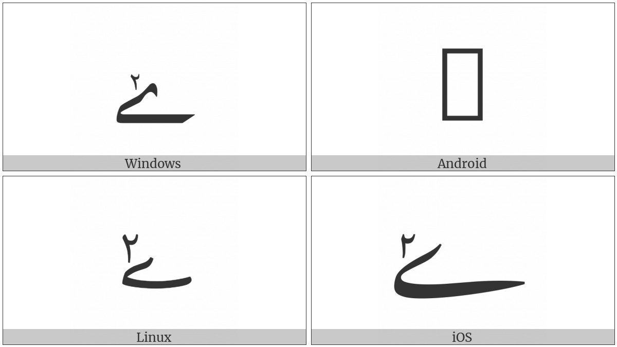 The image below shows how the “Arabic Letter Yeh Barree With Extended Arabic-Indic Digit Two Above” symbol might look like on different operating systems. If the font in which this web site is displayed does not contain the symbol and there is no fallback font able to render it, you can use the image below to get an idea of what it should look like.