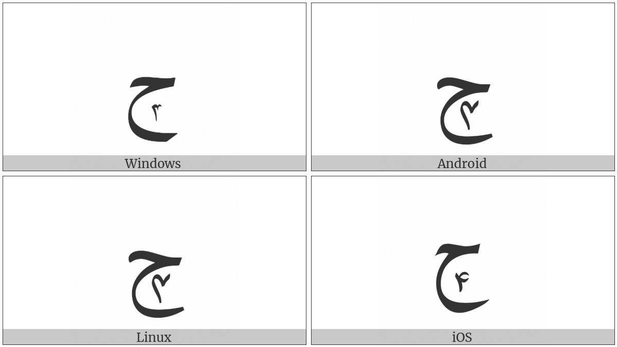 The image below shows how the “Arabic Letter Hah With Extended Arabic-Indic Digit Four Below” symbol might look like on different operating systems. If the font in which this web site is displayed does not contain the symbol and there is no fallback font able to render it, you can use the image below to get an idea of what it should look like.