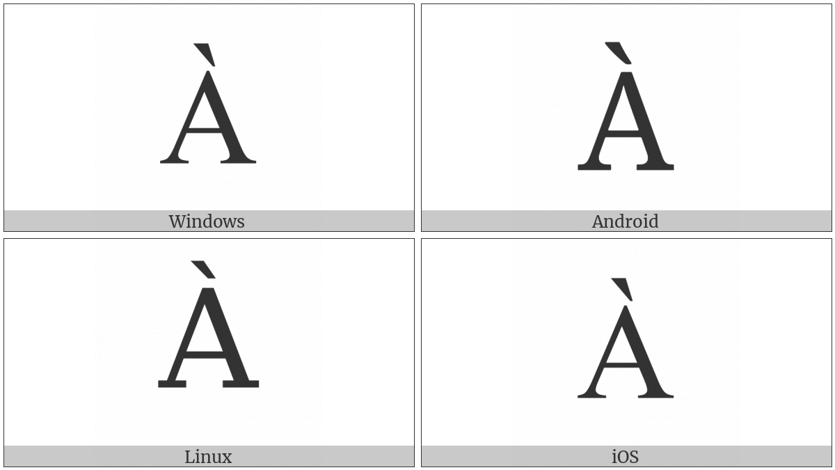 The image below shows how the “Latin Capital Letter A With Grave” symbol might look like on different operating systems. If the font in which this web site is displayed does not contain the symbol and there is no fallback font able to render it, you can use the image below to get an idea of what it should look like.