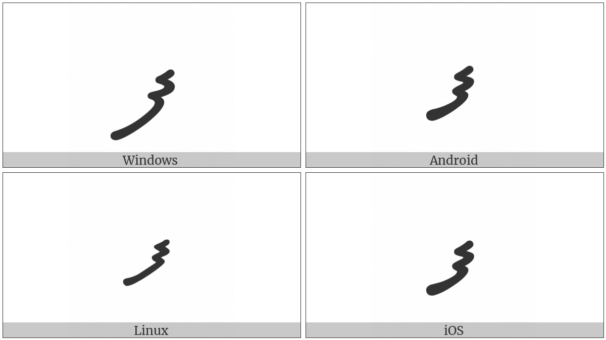 The image below shows how the “Thaana Letter Faafu” symbol might look like on different operating systems. If the font in which this web site is displayed does not contain the symbol and there is no fallback font able to render it, you can use the image below to get an idea of what it should look like.