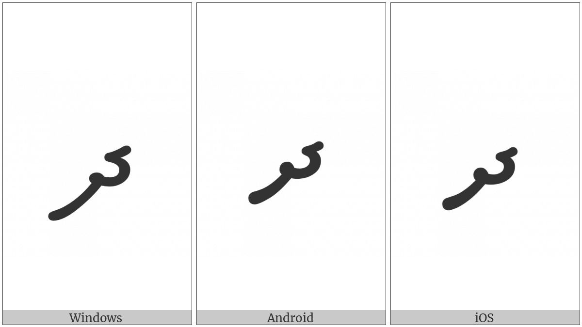 The image below shows how the “Thaana Letter Dhaalu” symbol might look like on different operating systems. If the font in which this web site is displayed does not contain the symbol and there is no fallback font able to render it, you can use the image below to get an idea of what it should look like.
