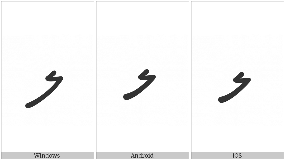 The image below shows how the “Thaana Letter Laamu” symbol might look like on different operating systems. If the font in which this web site is displayed does not contain the symbol and there is no fallback font able to render it, you can use the image below to get an idea of what it should look like.