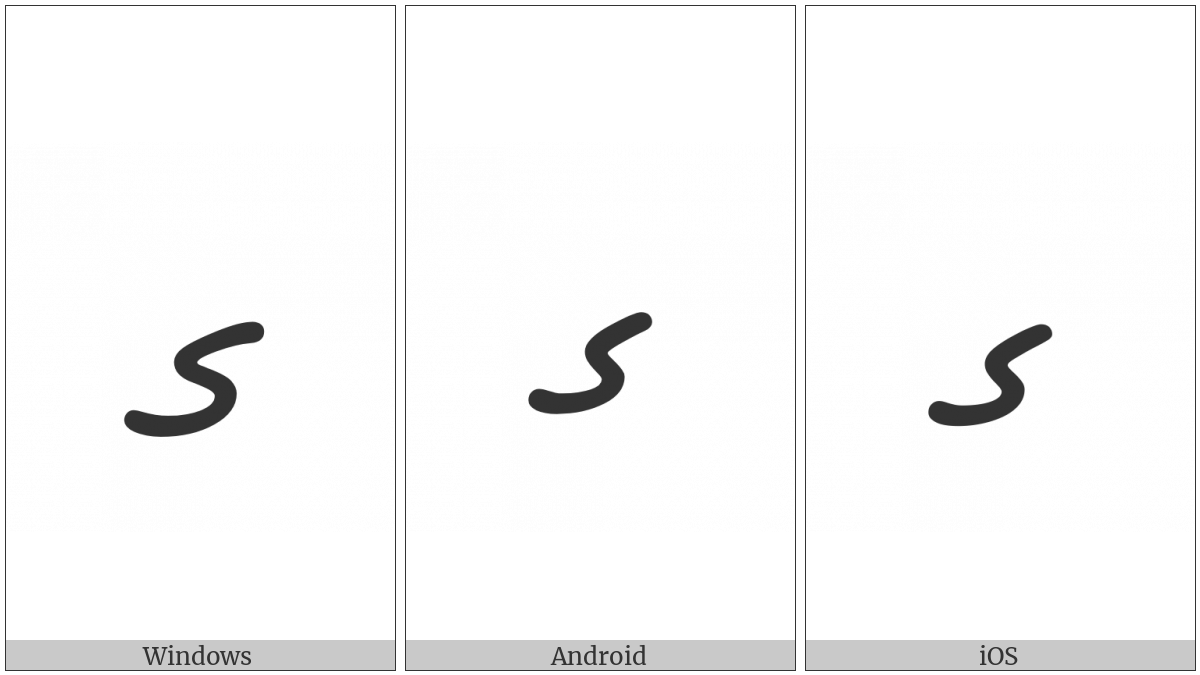 The image below shows how the “Thaana Letter Gaafu” symbol might look like on different operating systems. If the font in which this web site is displayed does not contain the symbol and there is no fallback font able to render it, you can use the image below to get an idea of what it should look like.