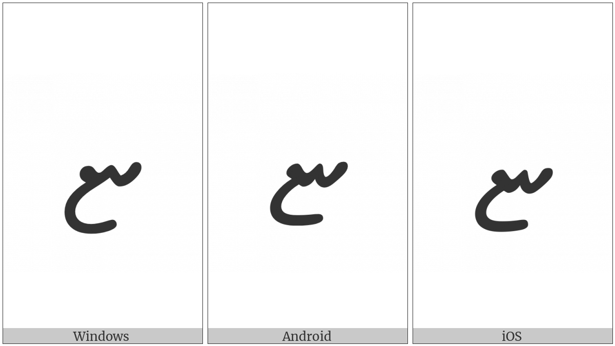 The image below shows how the “Thaana Letter Gnaviyani” symbol might look like on different operating systems. If the font in which this web site is displayed does not contain the symbol and there is no fallback font able to render it, you can use the image below to get an idea of what it should look like.