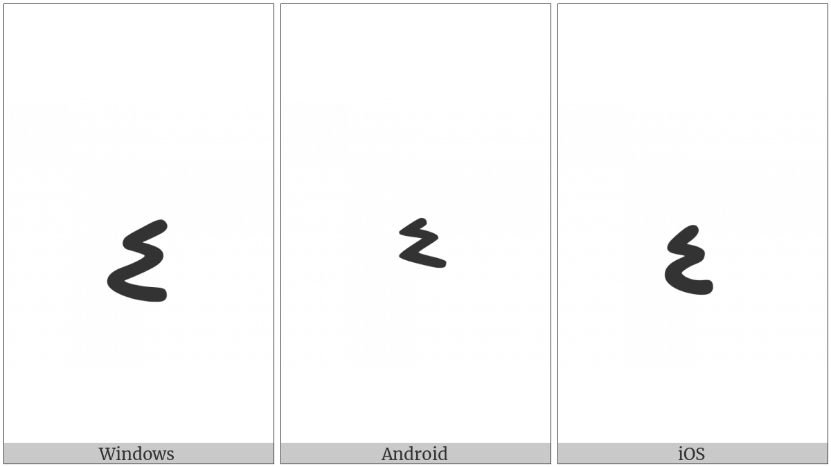 The image below shows how the “Thaana Letter Daviyani” symbol might look like on different operating systems. If the font in which this web site is displayed does not contain the symbol and there is no fallback font able to render it, you can use the image below to get an idea of what it should look like.