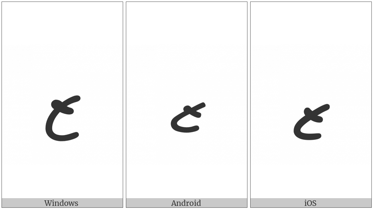 The image below shows how the “Thaana Letter Zaviyani” symbol might look like on different operating systems. If the font in which this web site is displayed does not contain the symbol and there is no fallback font able to render it, you can use the image below to get an idea of what it should look like.