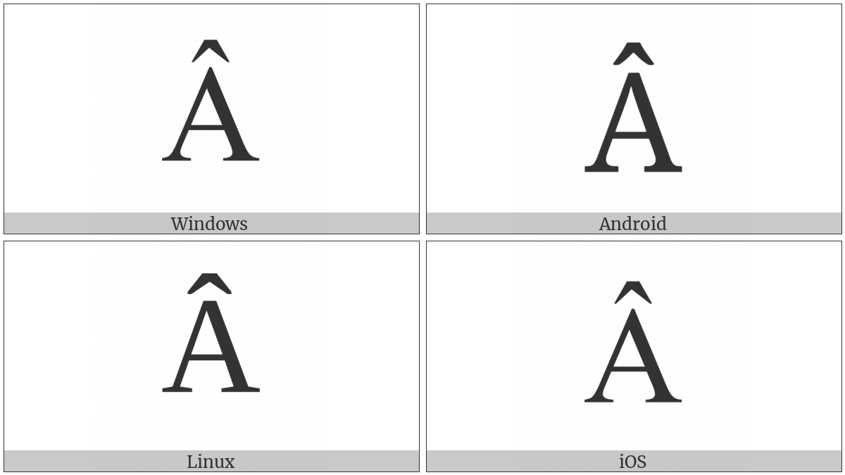 The image below shows how the “Latin Capital Letter A With Circumflex” symbol might look like on different operating systems. If the font in which this web site is displayed does not contain the symbol and there is no fallback font able to render it, you can use the image below to get an idea of what it should look like.