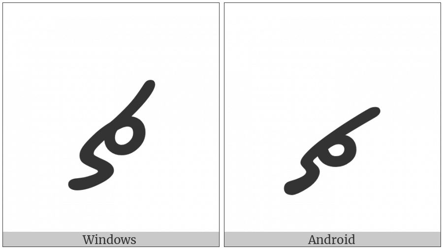 The image below shows how the “Thaana Letter Chaviyani” symbol might look like on different operating systems. If the font in which this web site is displayed does not contain the symbol and there is no fallback font able to render it, you can use the image below to get an idea of what it should look like.