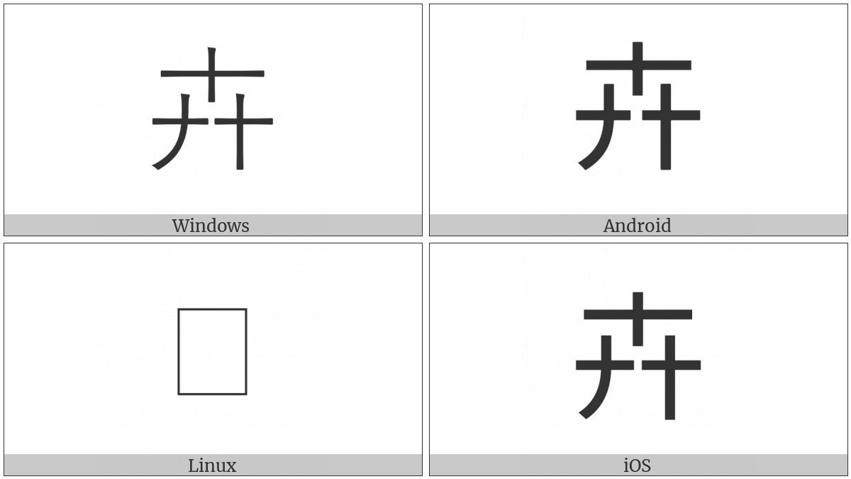 The image below shows how the “Cjk Compatibility Ideograph-2F82C” symbol might look like on different operating systems. If the font in which this web site is displayed does not contain the symbol and there is no fallback font able to render it, you can use the image below to get an idea of what it should look like.