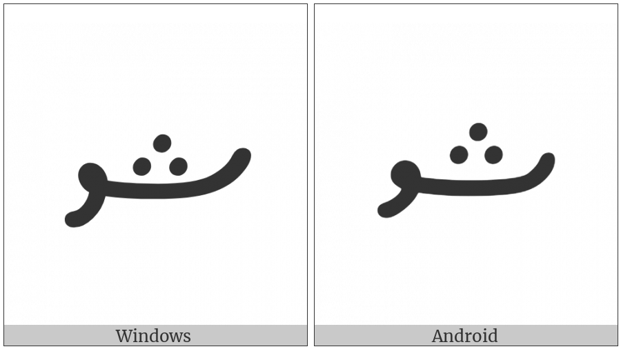 The image below shows how the “Thaana Letter Sheenu” symbol might look like on different operating systems. If the font in which this web site is displayed does not contain the symbol and there is no fallback font able to render it, you can use the image below to get an idea of what it should look like.