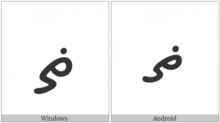 The image below shows how the “Thaana Letter Zo” symbol might look like on different operating systems. If the font in which this web site is displayed does not contain the symbol and there is no fallback font able to render it, you can use the image below to get an idea of what it should look like.