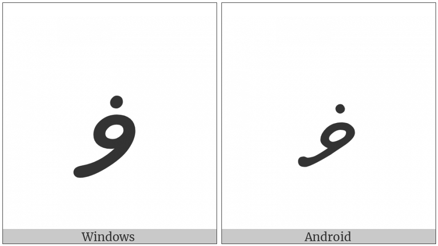 The image below shows how the “Thaana Letter Waavu” symbol might look like on different operating systems. If the font in which this web site is displayed does not contain the symbol and there is no fallback font able to render it, you can use the image below to get an idea of what it should look like.