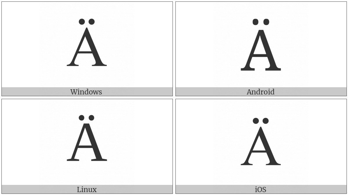 The image below shows how the “Latin Capital Letter A With Diaeresis” symbol might look like on different operating systems. If the font in which this web site is displayed does not contain the symbol and there is no fallback font able to render it, you can use the image below to get an idea of what it should look like.