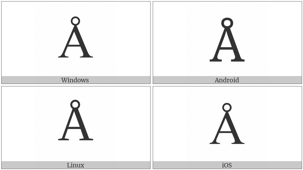 The image below shows how the “Latin Capital Letter A With Ring Above” symbol might look like on different operating systems. If the font in which this web site is displayed does not contain the symbol and there is no fallback font able to render it, you can use the image below to get an idea of what it should look like.