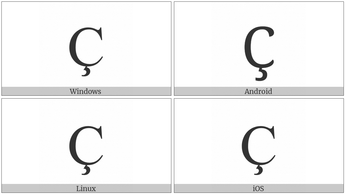 The image below shows how the “Latin Capital Letter C With Cedilla” symbol might look like on different operating systems. If the font in which this web site is displayed does not contain the symbol and there is no fallback font able to render it, you can use the image below to get an idea of what it should look like.