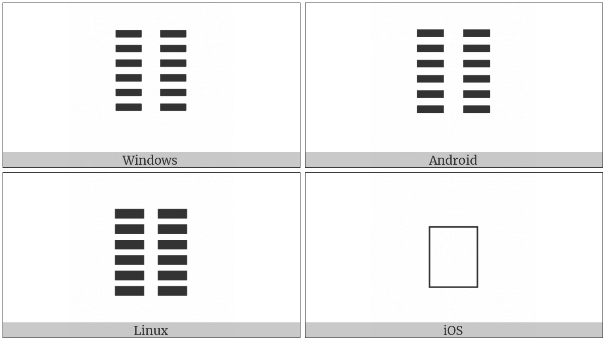 The image below shows how the “Hexagram For The Receptive Earth” symbol might look like on different operating systems. If the font in which this web site is displayed does not contain the symbol and there is no fallback font able to render it, you can use the image below to get an idea of what it should look like.
