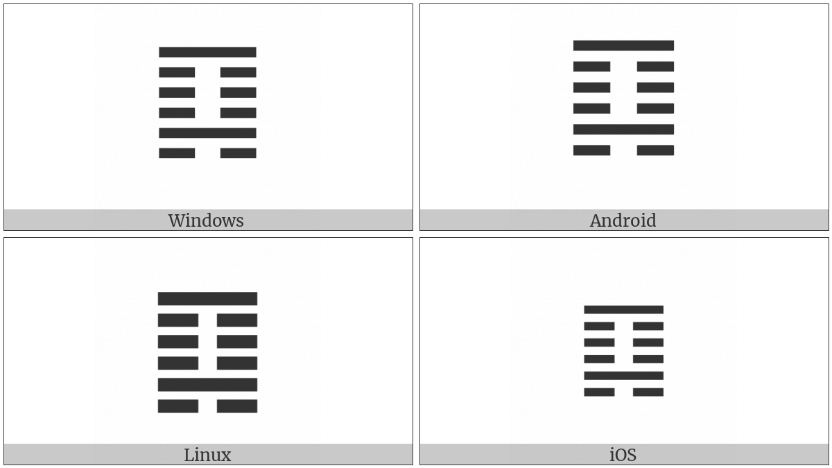 The image below shows how the “Hexagram For Youthful Folly” symbol might look like on different operating systems. If the font in which this web site is displayed does not contain the symbol and there is no fallback font able to render it, you can use the image below to get an idea of what it should look like.