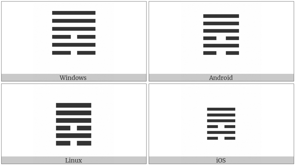 The image below shows how the “Hexagram For Conflict” symbol might look like on different operating systems. If the font in which this web site is displayed does not contain the symbol and there is no fallback font able to render it, you can use the image below to get an idea of what it should look like.