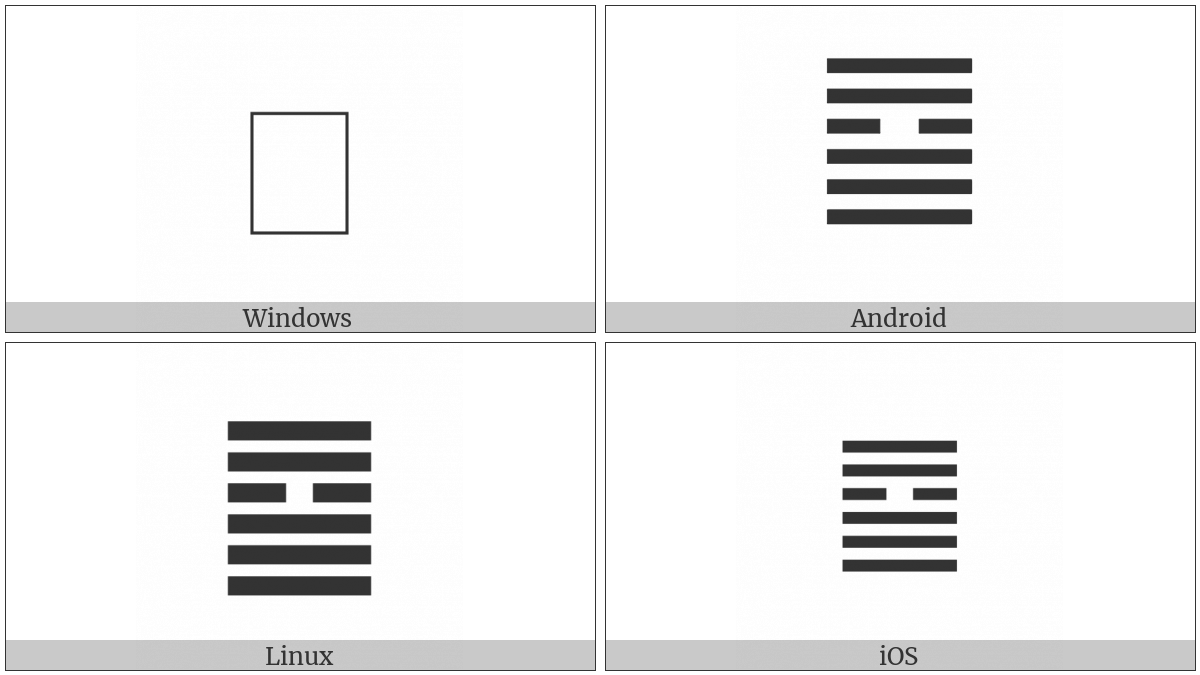 The image below shows how the “Hexagram For Small Taming” symbol might look like on different operating systems. If the font in which this web site is displayed does not contain the symbol and there is no fallback font able to render it, you can use the image below to get an idea of what it should look like.