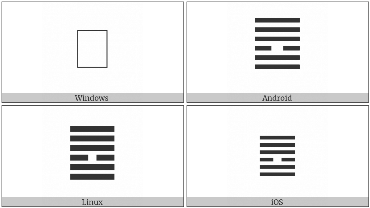 The image below shows how the “Hexagram For Treading” symbol might look like on different operating systems. If the font in which this web site is displayed does not contain the symbol and there is no fallback font able to render it, you can use the image below to get an idea of what it should look like.